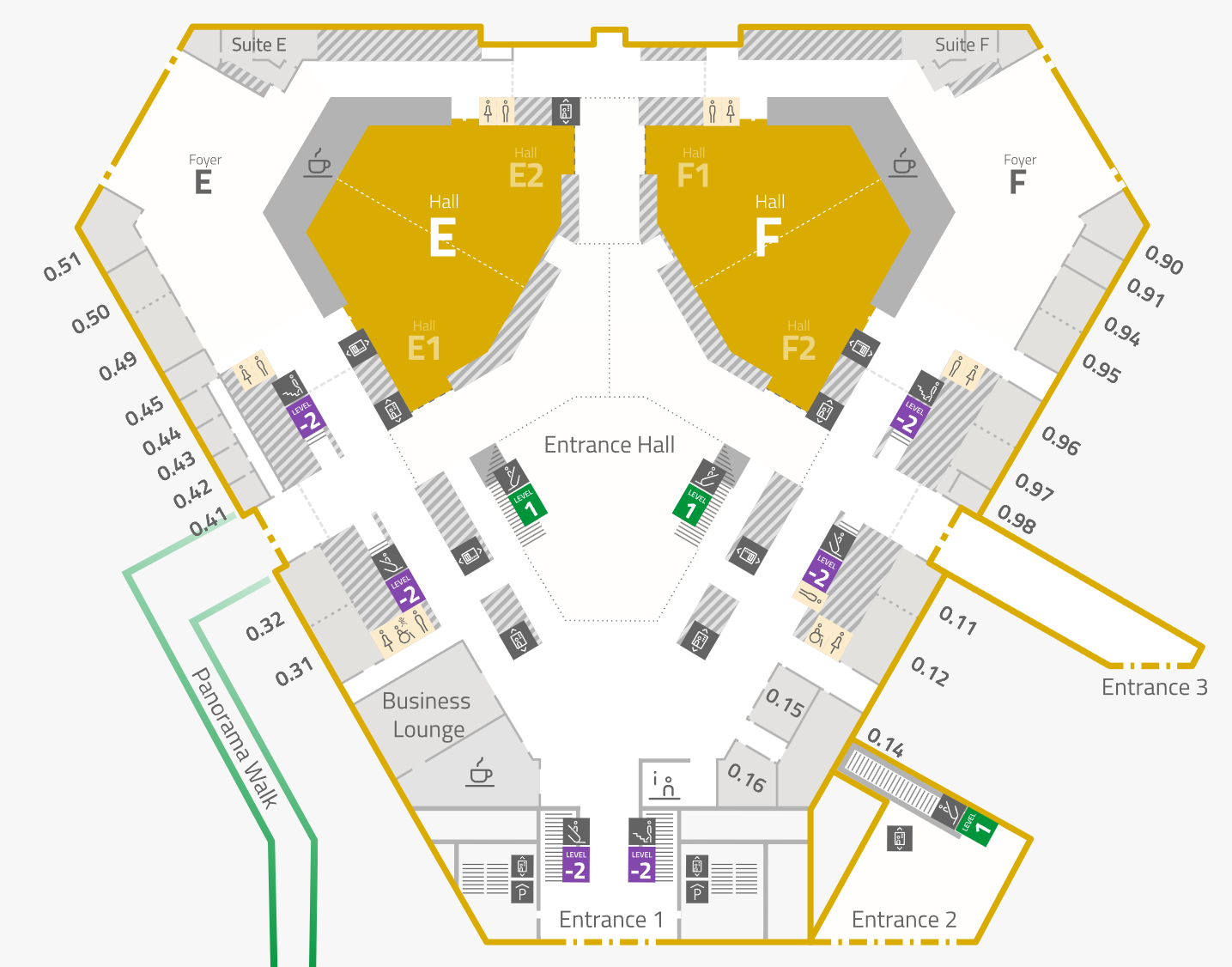You will enter the ACV at level 0, where you will also find the registration desk. The auditorium hall is at level 0, and we also reserved rooms at level 1. Coffee breaks and the conference dinner on Wednesday will take place at level 0.
