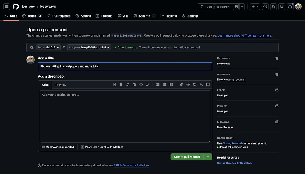 Finally, you can request a PR from your fork to the current branch of the upstream ieee-vgtc/ieeevis.org repository (e.g., “ieee-vgtc/ieeevis.org:vis2026” from “yelper/ieeevis.org:master”).